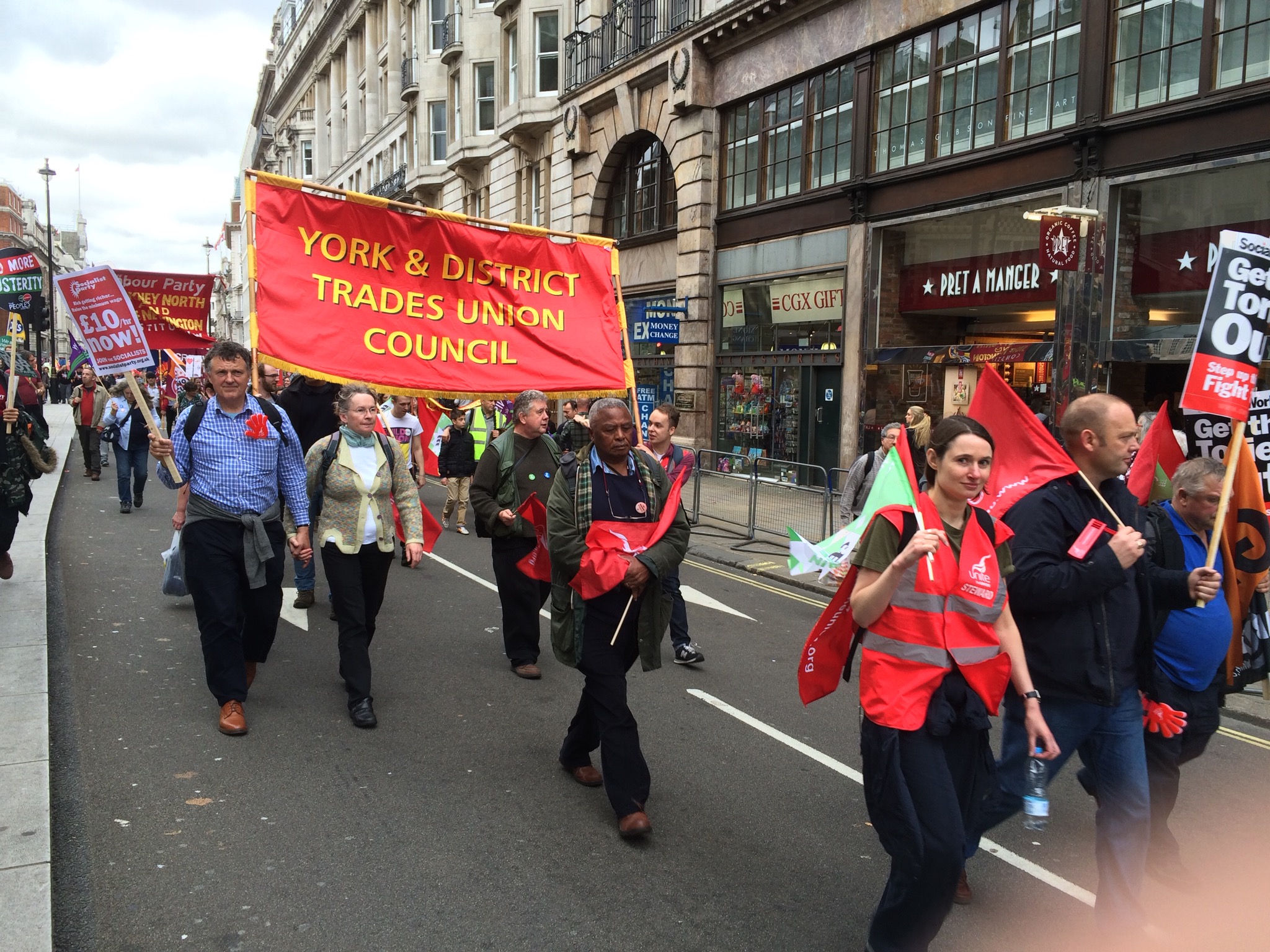 The rally ended some 45 minutes ago and all the happy campers have gathered on Park Lane to board the coach. I’ve waved them all off and they’re headed home (I’m staying in London a couple of days). Special thanks to Reece and Steven for carrying the York TUC banner!